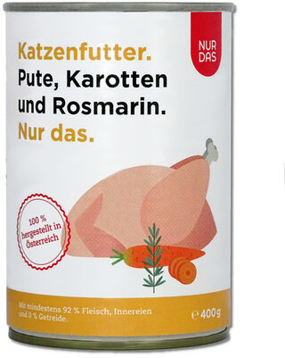 NUR DAS Katzenfutter ist eine ausgewogene Mischung aus leckerer Pute, vitaminreichen Karotten und auserlesenen Rosmarin.